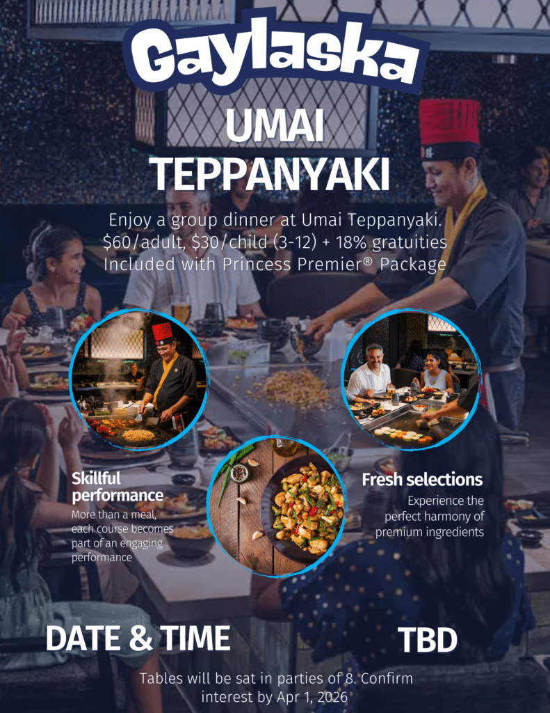 The Gaylaska Cruise sails June 21 to June 28, 2026, round-trip from Seattle aboard the Star Princess. You’ll visit Ketchikan, Juneau, and Skagway, enjoy scenic cruising through Endicott Arm and Dawes Glacier, and stop in Victoria, Canada before returning to Seattle.